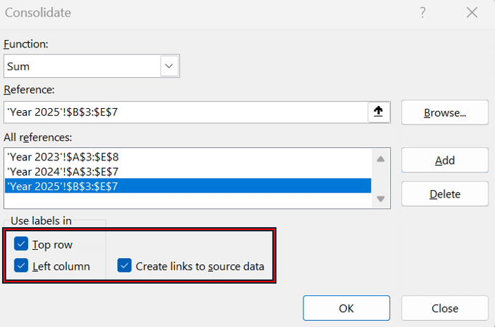 - If you leave ‘Top Row’ and ‘Left Column’ unchecked, then the platform combines all the cells positioned similarly, such as: cells C5 (Year 2023) + C5 (Year 2024) + C5 (Year 2025). Avoid this by clicking on the boxes.