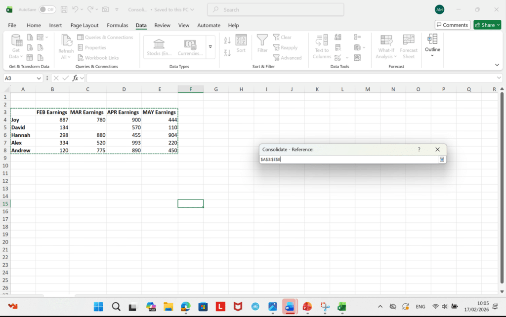 When we check the ‘Top Row’, we enable the consolidation tool to include our labels in the highest rows: February, March, April, and May Earnings.