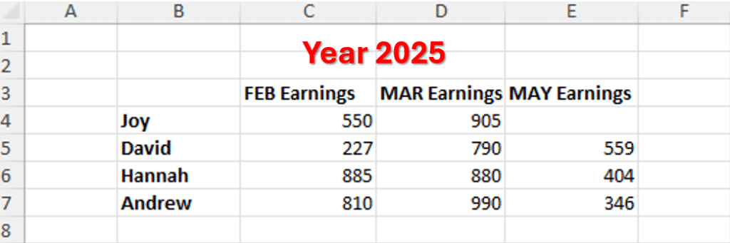 This means that David did not receive any commission in March 2023; nor did Hannah in April 2024 or Joy in May 2025. Joy’s row does not appear in Year 2024 and Alex’s is missing in Year 2025. There’s also a missing column in 2025, meaning no employee received commission for April.