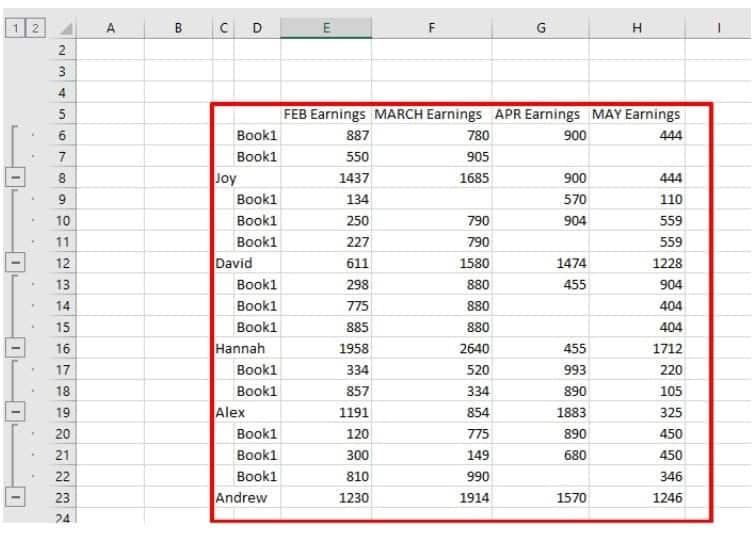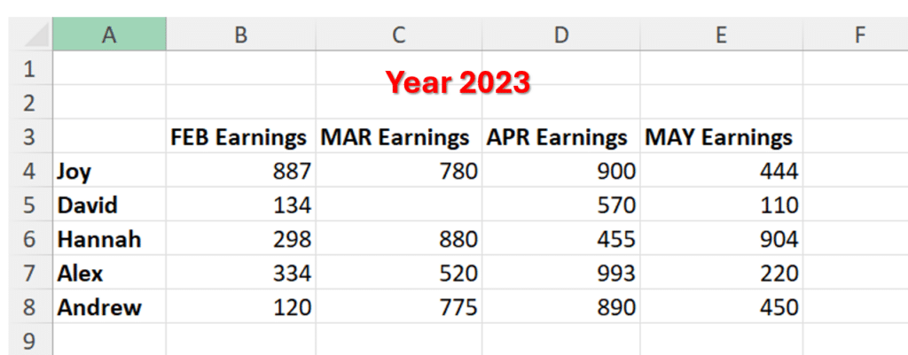 Let’s say you have data for the earnings of five employees, Joy, David, Hannah, Alex, and Andrew,- whose remuneration changes from month to month. Your data shows the monthly commission they each received from February to May.