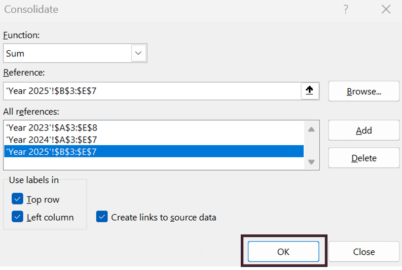 Press ‘Ok’ to authorize Excel to consolidate your information in the target worksheet.
