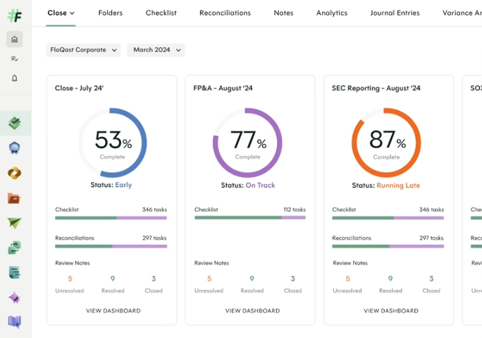 FloQast is a close management platform built by accountants for accountants. It organizes the month end close through task checklists, account reconciliation workflows, flux analysis, and ERP integration. FloQast is known for being intuitive and easy to adopt, especially for teams used to working in Excel. It integrates with 40+ ERPs including NetSuite, QuickBooks, and Sage Intacct.