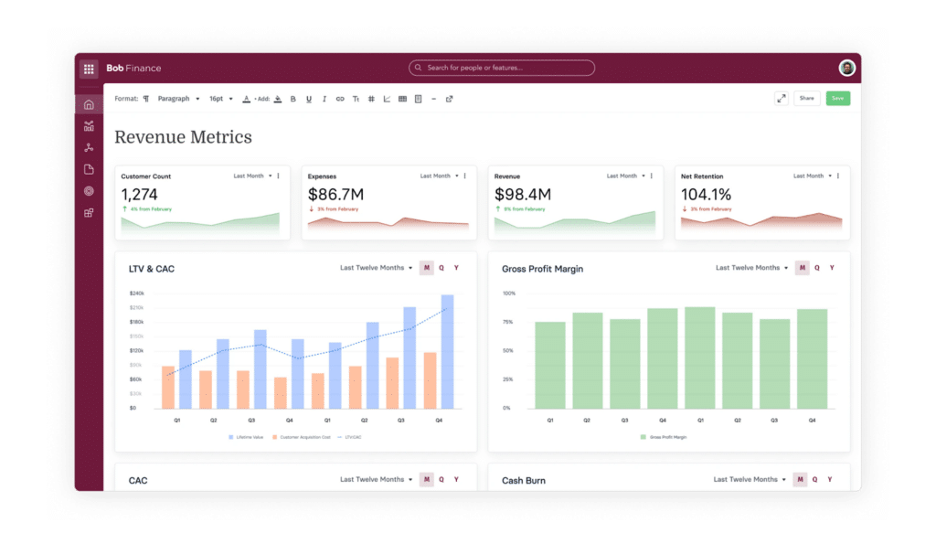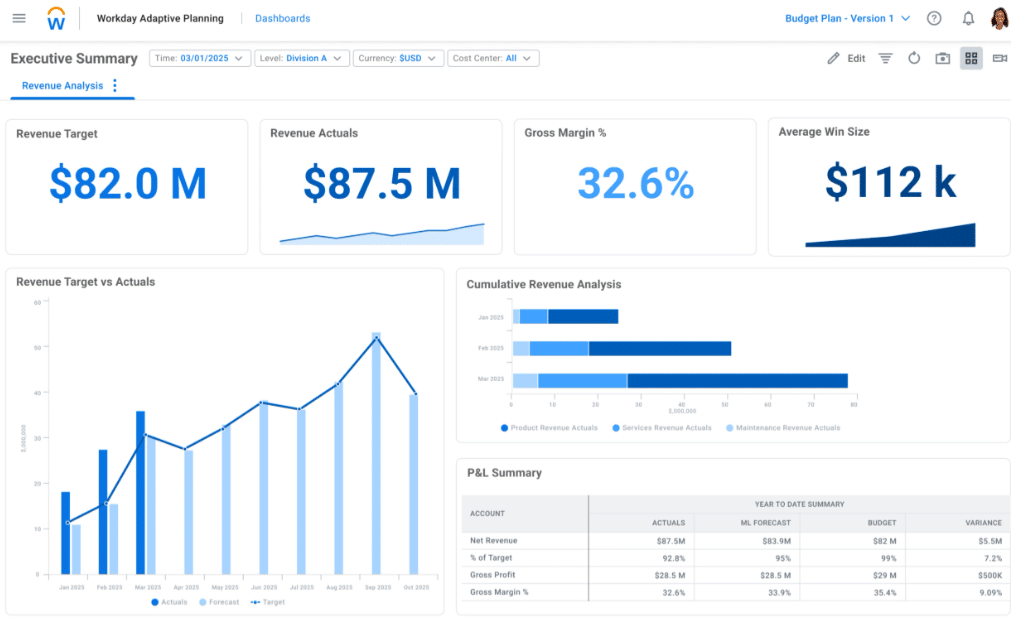A financial performance dashboard tracks key metrics like revenue, margin, and EBITDA, with the ability to drill into what’s driving results.